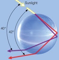 แสงอาทิตย์หรือรังสีที่ตามมองเห็น (Visible light) มีความยาวคลื่น 400 – 800 นาโนเมตร โดยที่แสงสีม่วงมีความยาวคลื่นสั้นที่สุดคือ 400 นาโนเมตร และแสงสีแดงมีความยาวคลื่นมากที่สุด ภายหลังฝนตกมักจะมีละอองน้ำหรือหยดน้ำเล็กๆ ลอยอยู่ในอากาศ จะทำหน้าที่เสมือนปริซึมหักเหแสงอาทิตย์ (White light) ให้แยกออกเป็นสเปกตรัม 7 สี ได้แก่ ม่วง คราม น้ำเงิน เขียว เหลือง แสด แดง โดยถ้าแสงอาทิตย์ทำมุมกับหยดน้ำแล้วหักเหเป็นมุม 40°เข้าสู่แนวสายตา ก็จะมองเห็นเป็นแสงสีม่วง แต่ถ้าแสงอาทิตย์ทำมุมกับหยดน้ำแล้วหักเหเป็นมุม 42°เข้าสู่แนวสายตา ก็จะมองเห็นเป็นแสงสีแดง